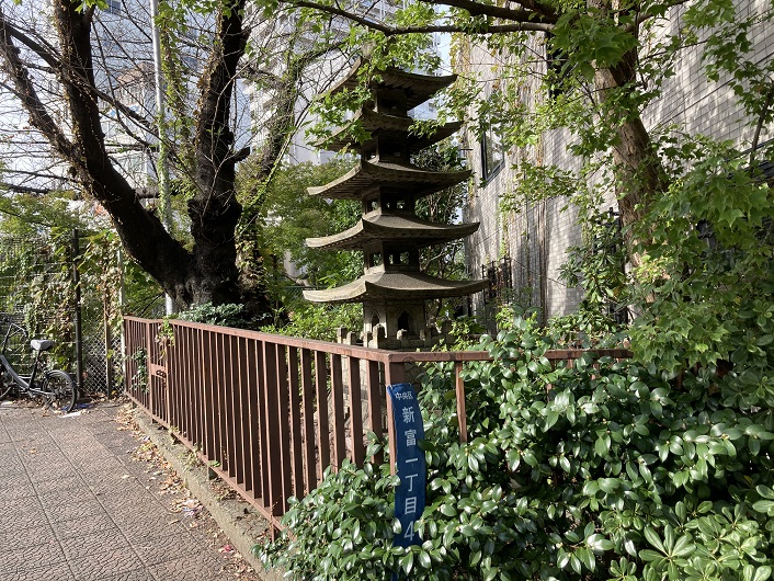 新富橋の橋詰めに石造りのミニ五重塔が建っていました。何か謂れでもあるのかなと帰ってからネットで調べて見ましたが、それらしい情報はありませんでした。何だろう?