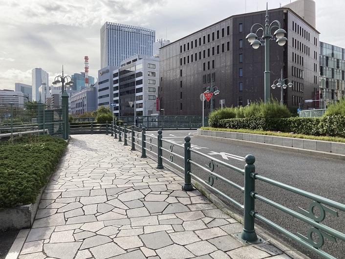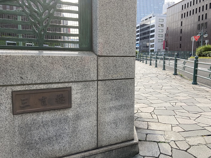 この橋は築地川の屈曲した地点に楓川と結ぶ水路(楓川・築地川連絡運河)が開削され、川が三叉の形となった所に関東大震災後の復興計画の一環として、昭和四年12月に三又の橋が架けられました。ここに川が存在し、人々の暮らしも川を中心に宮まれ、川筋を酒荷の船などか通った情緒ある風景も今は埋立てられ高速道路と化し、陸橋となりました。区では、平成四・五年にわたり、高欄には水辺に映える木立ちの姿を採り人れ、照明は架設した当時の鈴蘭燈に、又ー時期高速道路のランプとなり一部撤去された歩道も復元して古き風情を感じさせるテザインで修景しました。