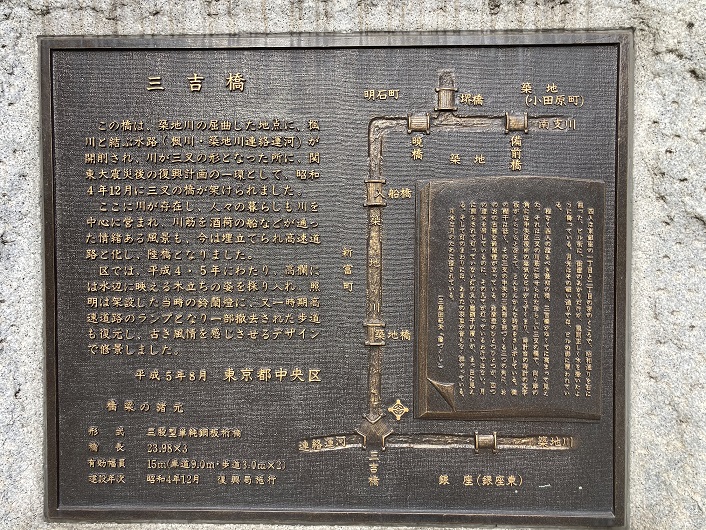 三吉橋の袂に石碑がありました。碑文には三吉橋の成り立ちと、橋を題材にした小説の一節が書かれています。ふたつの碑文の間には、築地川の川筋と楓川・築地川連絡運河の位置関係が描かれています。