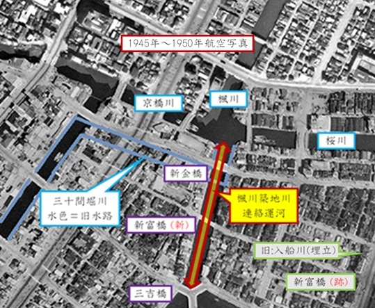 写真を見て分かりますように、楓川・築地川連絡運河は楓川・桜川・京橋川の合流点から築地川が直角に向きを変えるところまでまっすぐに掘られています。