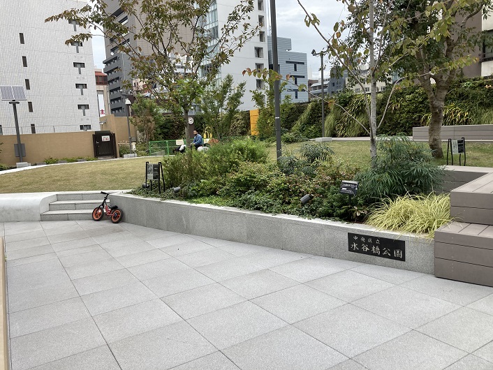 折角なので、豪華な水谷橋公園に行ってみることにします。屋上の公園には植栽がされていて、芝生の広場もあります。広場の先がかっての三十間掘川の川筋だったと思われます。