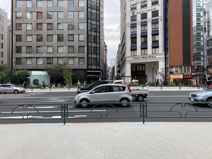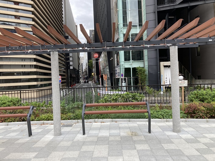 三原通りを真っ直ぐに進むと、晴海通りに突き当たります。通りの先にはミレニアム三井ガーデンホテルが建っています。その前の道路脇にベンチを備えたお洒落なスペースがありますが、これが三原橋地下街の跡地に造られた公園なのでしょうか?