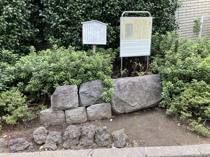 三原通りは御門通りに突き当たり、終点となります。御門通りを渡り、東京高速道路下の植栽の中に大きな石が置かれ、案内板が立っていました。