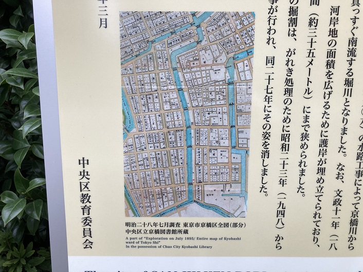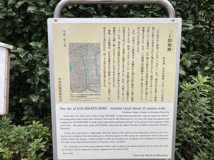 その隣りに三十間掘川の案内板が立っていました、私が見たところ、三十間掘川の案内板はここにあるのが唯一と思います。説明文の中にある年号とネットに書かれていた年号とが若干異なっています。三十間堀川の埋め立ては昭和二十四年ではなく昭和二十七年まで続いていたこと、川筋の改修は明治三十六年でなく明治三十九年であることです。ま、案内板は中央区教育委員会が設置したものなので、案内板の記述が正しいのでしょう。