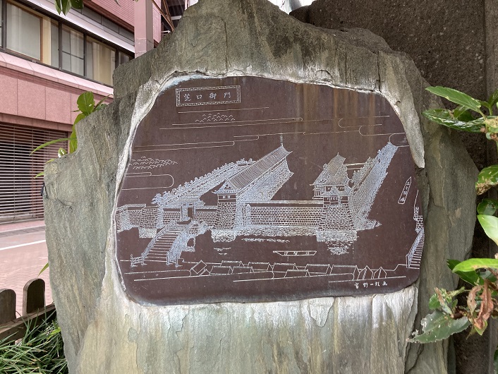 案内板が立っていた地点で三十間掘川の歩きを終えましたが、芝口御門通りの直ぐ先に芝口御門跡の石碑が置かれ、その奥に案内板が立っていました。三十間堀川は江戸城の外堀の更に外側に位置していたことが分かります。元々が江戸城の防衛のために造られたものではないからかもしれません。