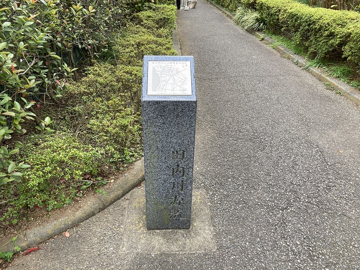 川の水質とは裏腹に、水路に沿って設けられている遊歩道(緑道よりか遊歩道の方が似つかわしい)は真新しく綺麗です。遊歩道の脇に「歴史の流れる音がする 内川案内板」が立っています。この先にも何カ所か設置されていますが、内容は現在地の表示以外は同じです。
