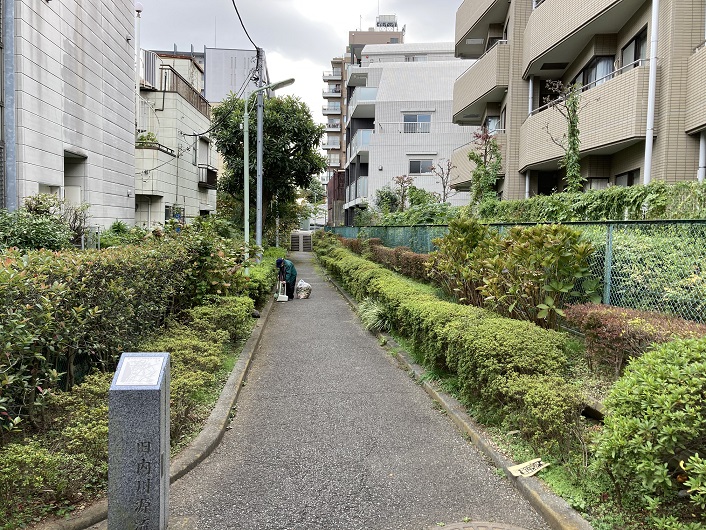 ネットの情報では、内川の源泉は北馬込二丁目13番地で、そこに源流を示す石碑が立っているとのことです。馬込駅から地図を頼りに源泉を目指します。この辺りはアップダウンの坂が多く、住宅が込み入っていて目指す住所にはなかなか辿り着けません。かなりの急坂を下りたところに目指す番地がありました。三方から傾斜が迫ってくるようなすり鉢状の底にあたるところです。一方だけ両側に植栽が施された平坦な路地が続いています。その路地の起点になるところに「旧内川源流」の石碑が立っていました。石碑の上面に「昔の内川と六郷用水の流れ」とタイトルの付いた地図が埋め込んであります。地図には川筋が書き込んであるのですが、おおざっぱ過ぎてどう歩いたらいいのかサッパリ分かりません。とりあえず、旧内川の流路跡だったと思われる平坦な路地というか遊歩道というか緑道を進むことにします。