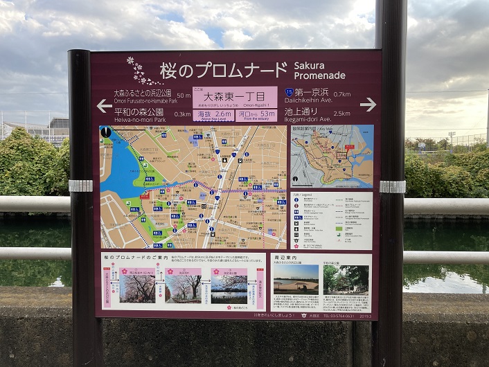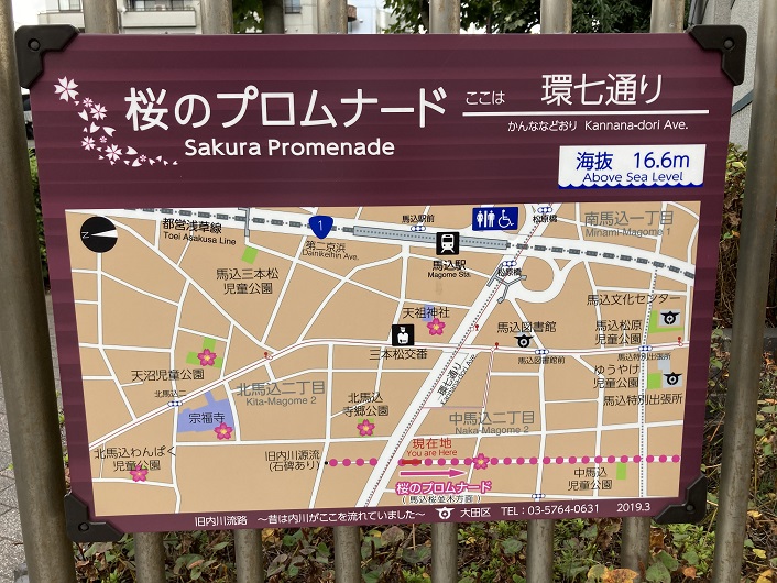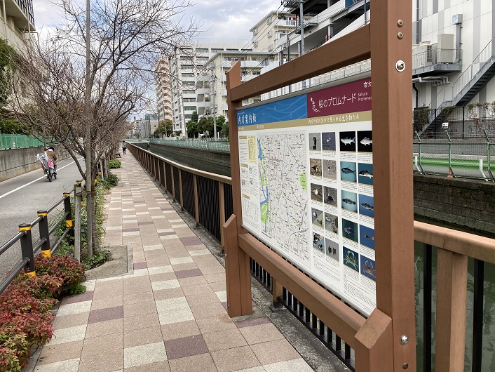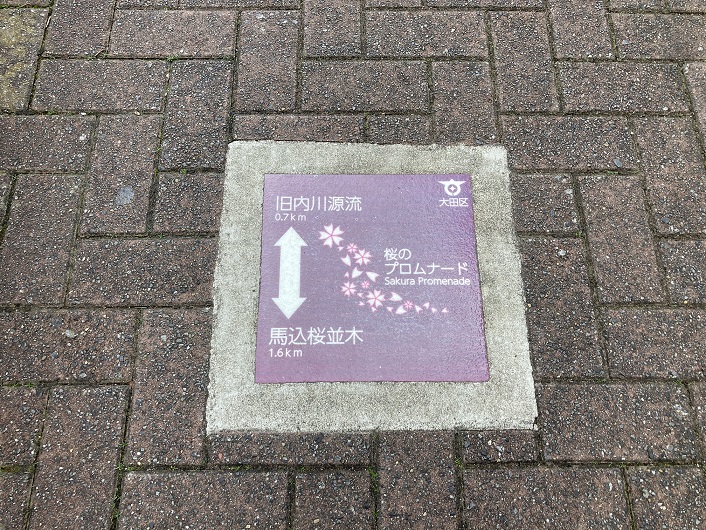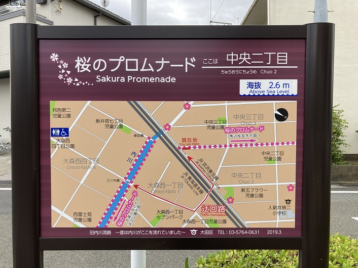 環七を渡って反対側に行きますと、環七の路面より一段低い位置から緑道が再開しています。緑道脇に「桜のプロムナード」という案内板が立っていました。この案内板はこの後あちこちで見かけることになるのですが、周辺の地図や名所など、歩く上で役立つ情報が満載です。案内板の下の方には「旧内川流路〜昔は内川がここを流れていました〜」の文言が添えられています。つまり、内川はこの案内板に図示されている桜のプロムナードの線に従って歩けばいいのです。案内板は落書きもなく綺麗で分かりやすく、これで不明だった東海道線に突き当たるまでの旧内川の川筋は問題なく辿れそうです。