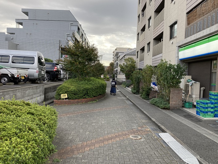 緑道は場所によってかなり幅があり、生活道路としても十分に機能しています。進路が変わるところなどには路面に矢印で方向が示されていることもあります。