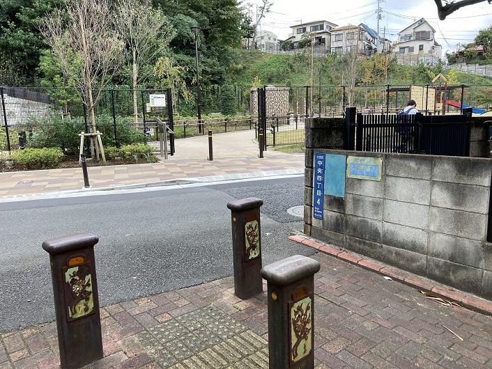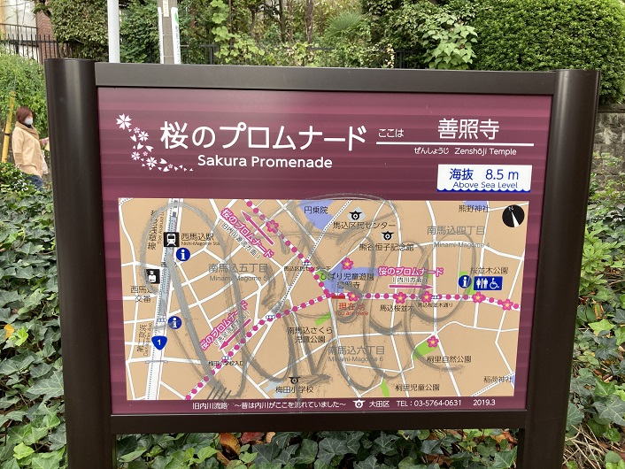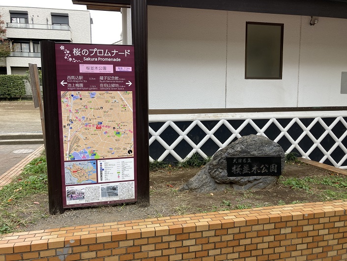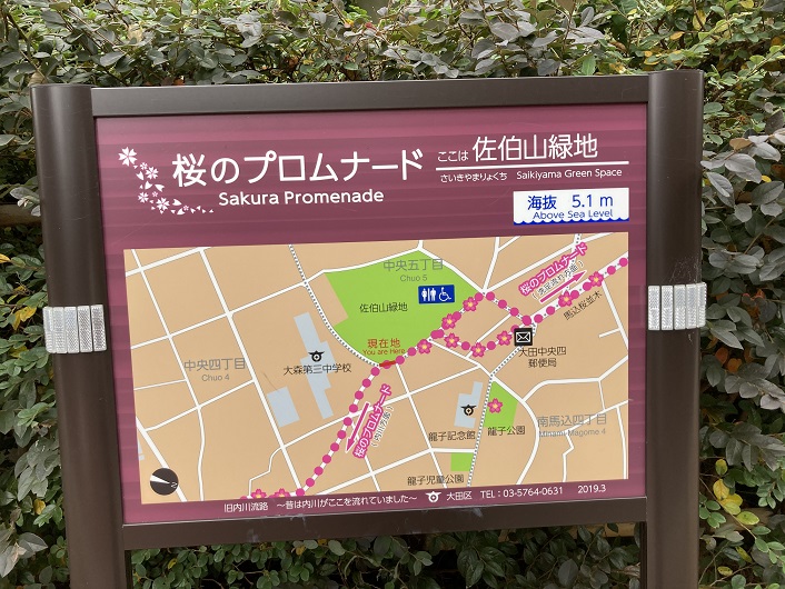 路地を曲った先に真新しい公園があります。佐伯山緑地という名前の公園だそうです。昨年春に完成したとかで、ピッカピカの筈です。佐伯山という名称は、ここが元佐伯栄養専門学校の跡地に作られたことに由来しています。池上近辺では池上本門寺に匹敵する敷地面積があったそうです。山が正面にあるということは、川筋が左右どちらかに向きを変えなければなりません。ところが、公園前には標識がありません。最初は右側に折れて歩道を進んだのですが、どこを見ても川筋の痕跡がありません。そこで左手に進んでみましたら、桜のプロムナードの案内板が見つかりました。ヤレヤレです。公園の縁を進んだ後で公園を離れ、住宅地の道路を進みます。