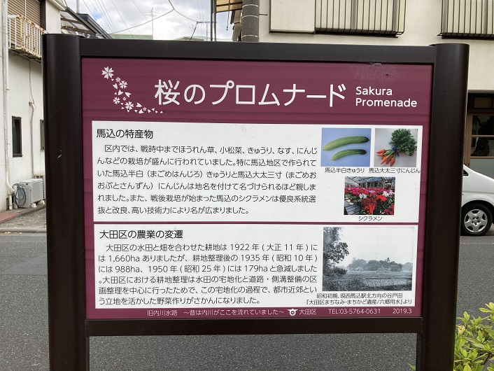 区内では、戦時中までほうれん草・小松菜・きゅうり・なす・にんじんなどの栽培が盛んに行われていました。特に馬込地区で作られていた馬込半白(まごめはんじろ)きゅうりと馬込大太三寸(まごめおおぶとさんずん)にんじんは地名を付けて名づけられるほど親しまれました。また、戦後栽培が始まった馬込のシクラメンは優良系統選抜と改良、高い技術力により名が広まりました。