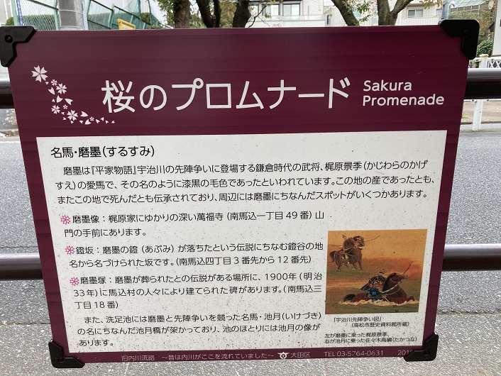 緑道脇に案内板がふたつ立っていました。名馬・磨墨の伝説にも関係しますが、ここ馬込にはかって馬込九十九谷といわれたほど起伏があり、駒込や牛込と同じように古くからの馬の放牧地としての利用が地名の由来といわれています。