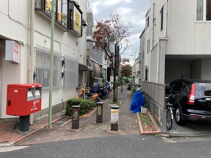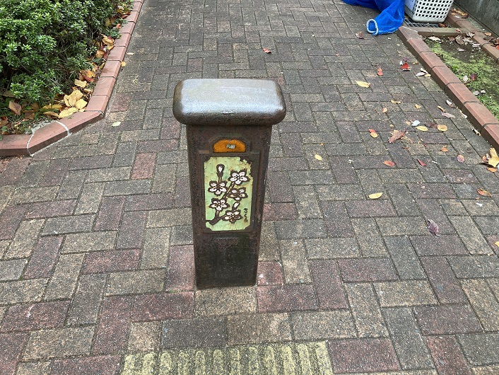 緑道の先は郵便局横の路地に繋がっています。車止めのボラードには桜の花の模様が描かれていて、ここも桜のプロムナードであることを表しています。