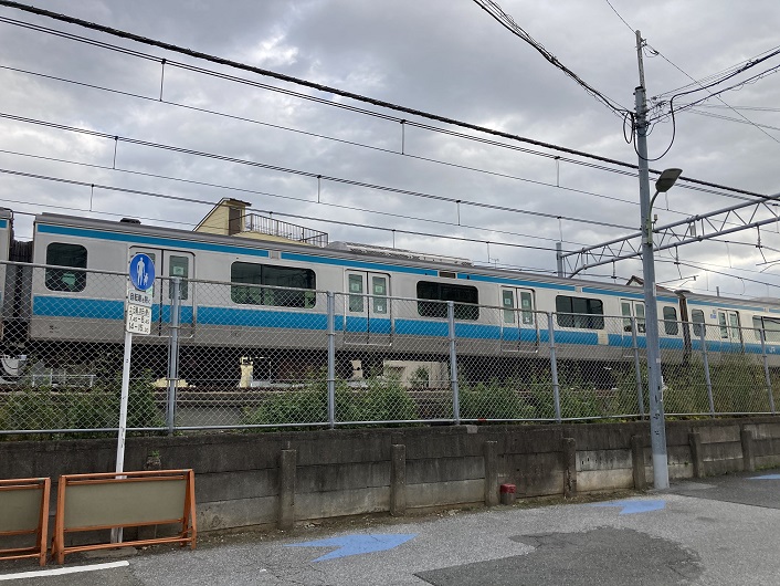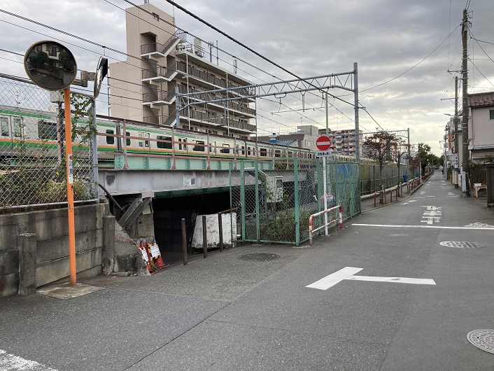 いよいよ旧内川が現内川に変身する場所にやってきました。桜のプロムナードは東海道線(および京浜東北線)の線路に突き当たり、一旦終わります。突き当たった場所には線路を越えるような施設はありませんので、案内板には迂回路が示されています。でもかなり離れていますね。
