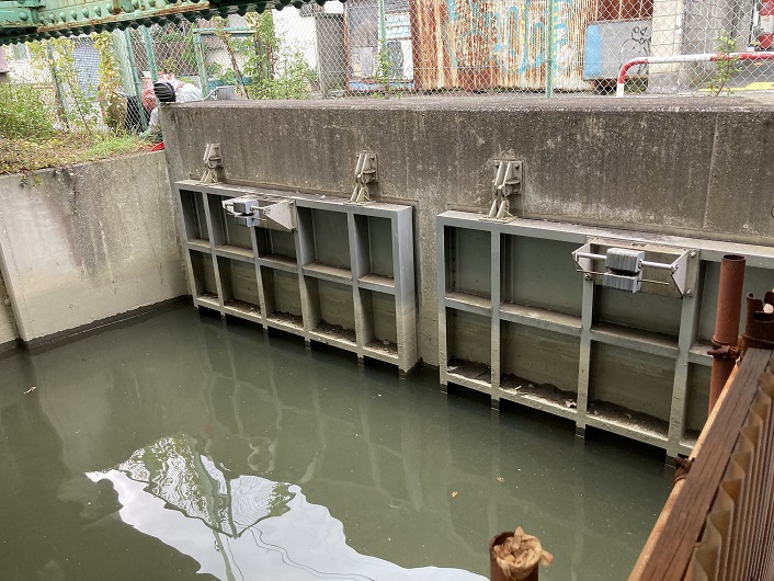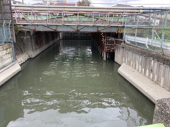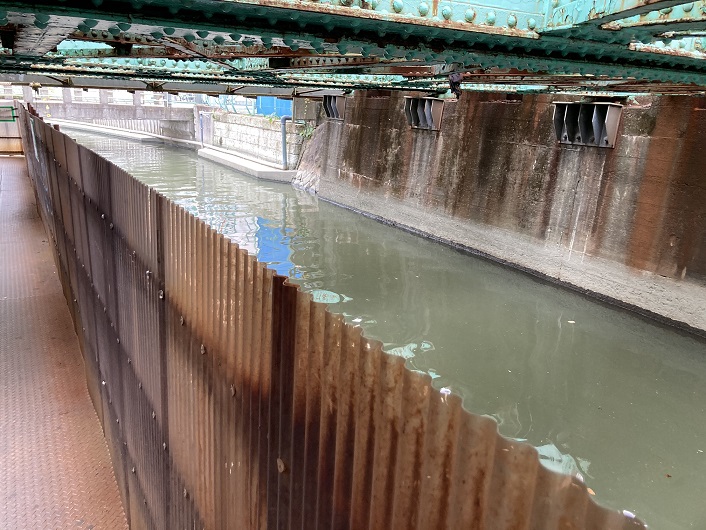 全速力で通り抜けても、記録だけはちゃんと残します。トンネル内でしか撮れないアングルでの旧内川の排水扉は必見です。通常時は扉は閉じられているそうですが、大雨などで下水管が一杯になると開放されるらしいです。その結果は推して知るべし。ちなみに、扉の先から京浜運河との合流地点までは本来の川の水でなく、海水で満たされているのだそうです。海水にしては川の水は灰色に濁っていますね。ここからは現内川の水路になります。