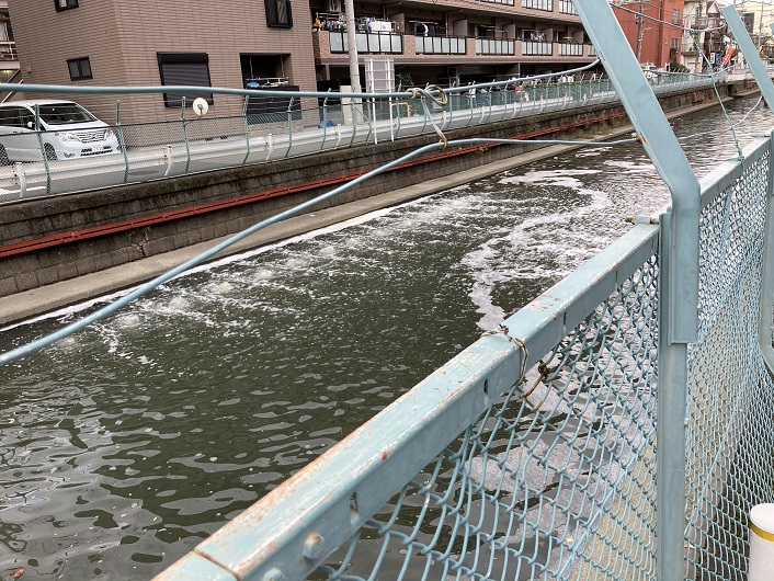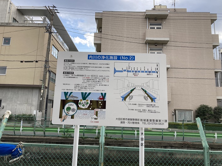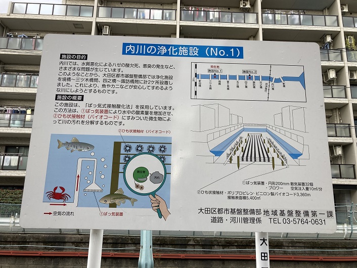 内川では、水質悪化によるハゼの酸欠死、悪臭の発生など、さまざまな問題が生じています。このようなことから、大田区都市基盤整備部では浄化施設を境橋〜三ツ木橋間、四之橋〜諏訪橋間に計2ケ所設置しました。これにより、魚やカニなどが安心してすめるような川にしようとするものです。