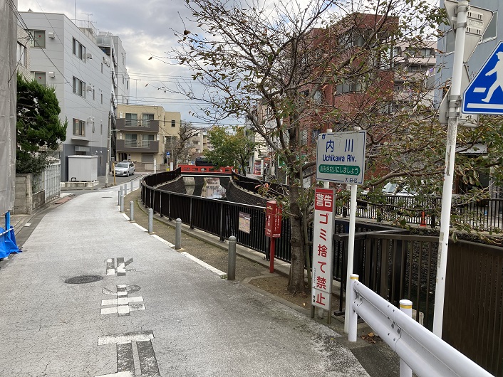 第一京浜より海側を通るのは旧東海道です。その旧東海道の内川に架かる橋が「内川橋」です。何故か欄干が朱色に塗られています。