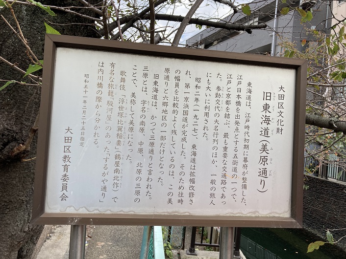 東海道は、江戸時代初期に幕府が整備した、江戸日本橋を出発点とする五街道の一つで、江戸と京都を結ぶ、最も重要な交通路であった。参勤交代の大名行列のほか、一般の旅人にも大いに利用された。昭和二年(1927年)、東海道は拡幅改修され、第一京浜国道が完成した。そのため往時の幅員を比較的よく残しているのは、この美原通りと六郷地区の一部だけとなった。旧東海道は、かつて三原通りと言われた。三原とは、字名の南原・中原・北原の三原のことで、美称して美原になった。歌舞伎「浮世塚比翼稲妻」(鶴屋南北作)で有名な旅龍「駿河屋」のあった「するがや通り」は内川橋の際から分かれる。