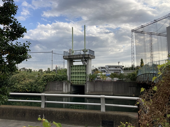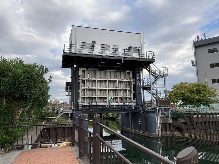 いよいよ内川の河口が見えてきました。内川水門と書かれた大きな防潮水門です。その横にも小さな水門がありますが、排水機場の出口なのでしょうか?