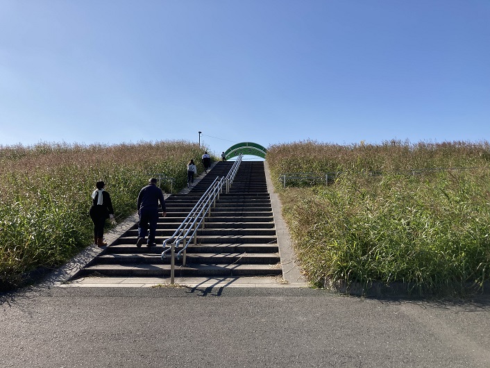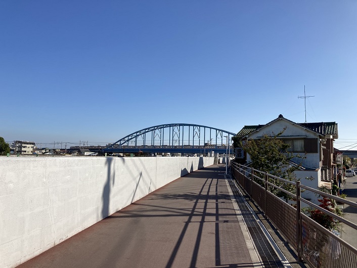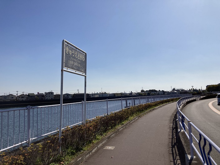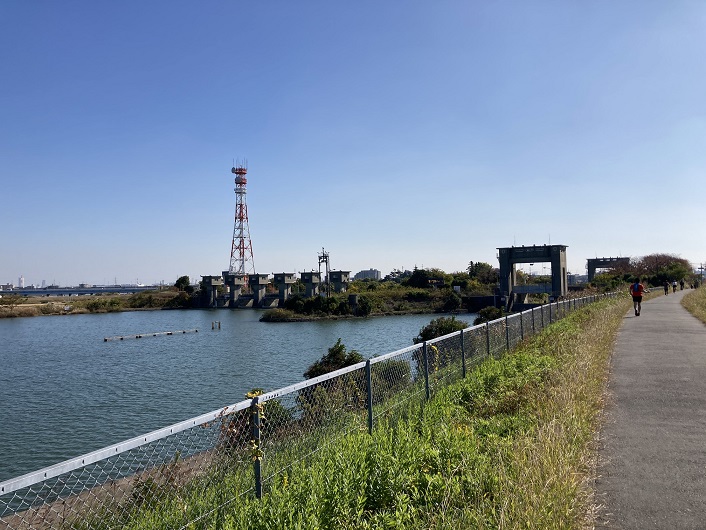 旧江戸川にはあまり河川敷はなく、堤防上に設けられた遊歩道を歩きます。車道から完全に切り離され、高度差もあるので安心して歩けます。