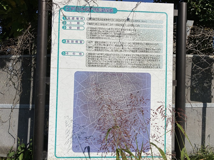 江戸川水閘門への入口に施設の概要を説明した案内板が立っています。文字が擦れてきていてよく読み取れないのですが、「1枚扉でもくり流出放流」って何でしょうか?