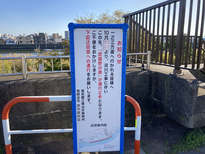 大雨の心配が少ない冬の時期は河川の工事が多いですね。遊歩道はこの先の長い区間が護岸工事で通行止めになっています。告知文の中に「武蔵野の路」という言葉が入っています。もう忘れられた幻の路になってしまったかと思っていましたが、今でもちゃんと生きているんですね。なんだか嬉しくなりました。