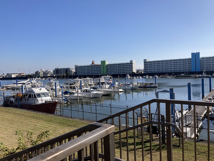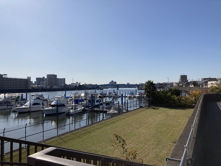 河岸にマリーナの施設が設けられています。この辺りは川幅が広く、流れも穏やかなので小型船の係留には最適ですね。