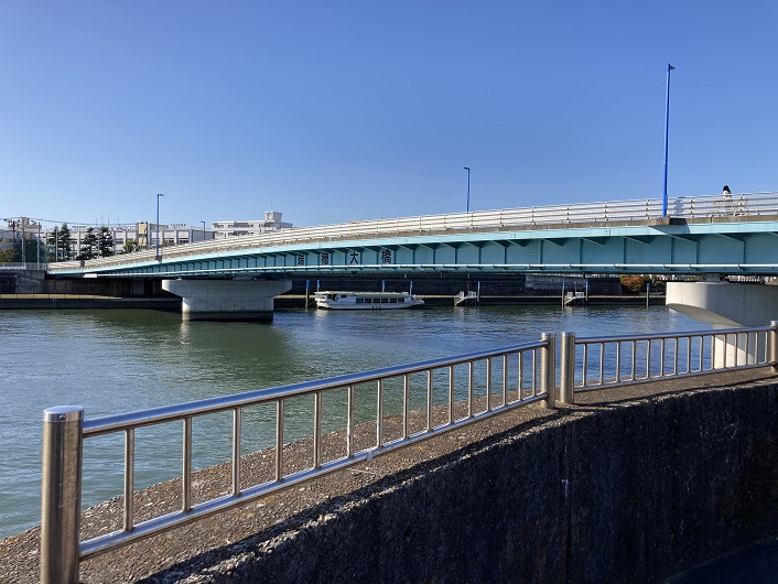 妙見島の下流側に東西線の鉄橋が架かっています。鉄橋を渡った先は千葉県の浦安市になります。