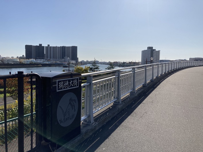 旧江戸川に合わさる地点の新中川には、瑞穂大橋が架かっています。橋名の下には稲穂のイラストが添えられています。人口密集地帯の橋に稲穂はちょっとそぐいませんね。橋の上流側には今井水門(今井橋は旧江戸川に架かる橋、新今井橋は新中川に架かる橋、今井水門は新中川河口に設けられています。ややこしいですね。)があります。現在は7門あるうちの4門が稼働中で、残り3門が改修工事のまっただ中です。