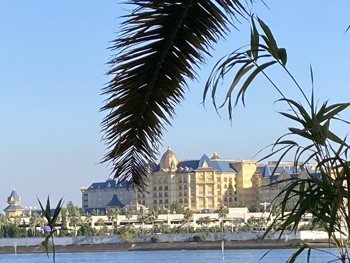 江戸川の河口の千葉県側には東京ディズニーランドの広大な敷地が拡がっています。シンデレラ城も遠望できますね。