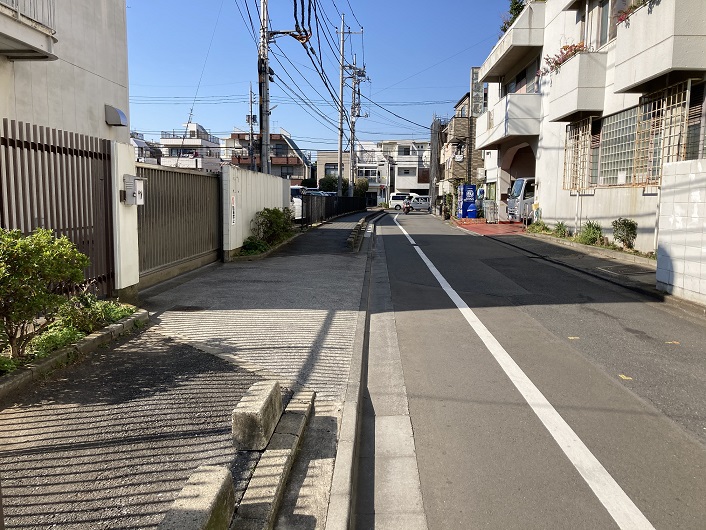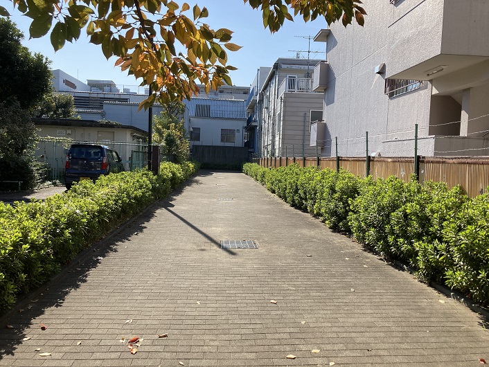 仕方がないので、もう一度八幡前交差点に戻り、三鷹通りを南下します。三鷹通りの歩道は煉瓦鋪装となっていて、何となく暗渠の上に造られたような感じです。仙川の開渠区間が始まりそうな位置で路地に入ります。路地の歩道も何となく暗渠の上を通っている感じです。