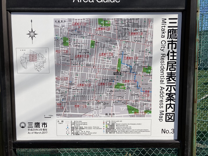 三鷹通りを大成高前交差点で左折し、山中通りを東に進みます。住居表示案内図を見て、細い路地に入り都営下連雀七丁目第三アパートの裏手に入りますと、大成高等学校の裏側を流れてきた仙川が目の前で直角に向きを変えています。案内図を見ても、この先連続的にクランク状(鍵型状)に曲って流路が続く仙川が見てとれます。
