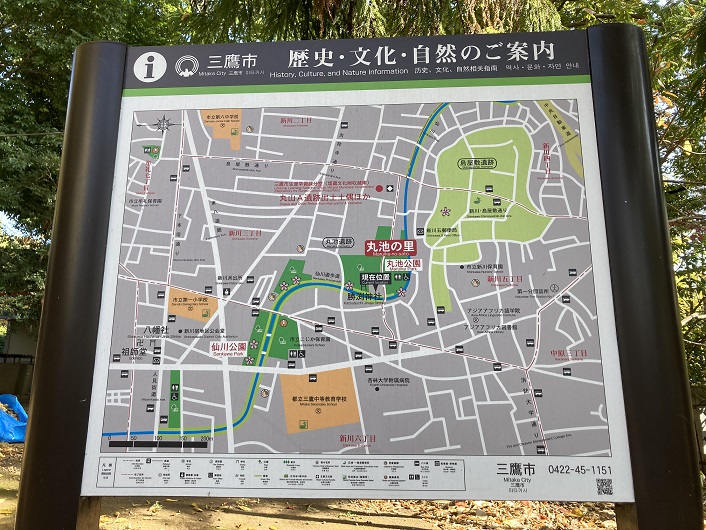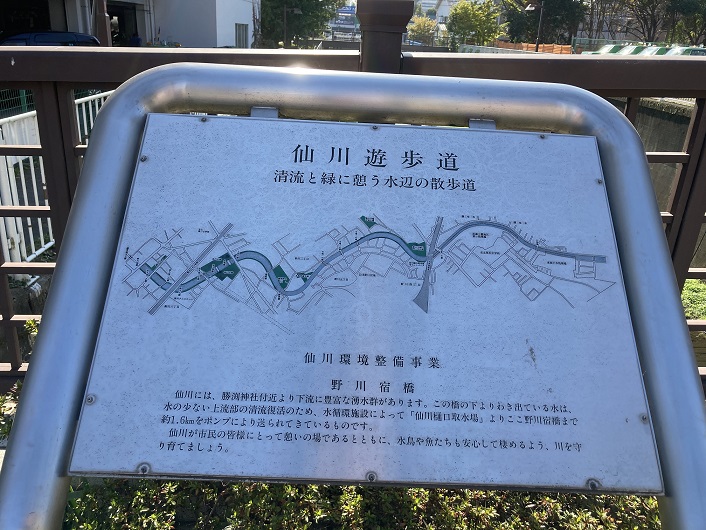 仙川の遊歩道はよく整備されています。この案内板は500mおきに設置されていて、橋から橋までの距離とか仙川の周辺情報も掲載されています。ゴールの鎌田橋までは未だ少し距離があるようです。
