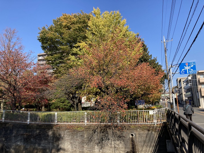 仙川は荒玉水道道路・世田谷通りと交差します。荒玉水道道路には大蔵水道橋が架かっています。橋の隣には巨大な水道管がむき出しのまま仙川を跨いでいます。荒玉水道道路を歩いたのは8月下旬の残暑の時期でした。はや晩秋。。。