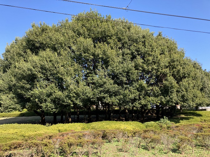 仙川公園の中にはひときわ巨大な木が立っています。周囲は低い灌木ばかりの見晴らしのよい場所なので、その大きさが余計に目立ちます。複数の木が集まって1本の木に見えるのかもしれませんが、昔テレビのCMに出てきた「日立の樹」とよく似ています。日立の樹は、ハワイ州オアフ島「モアナルア・ガーデン」にあるモンキーポッドだということですが、この木もとても印象に残る巨木(群)です。