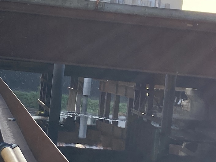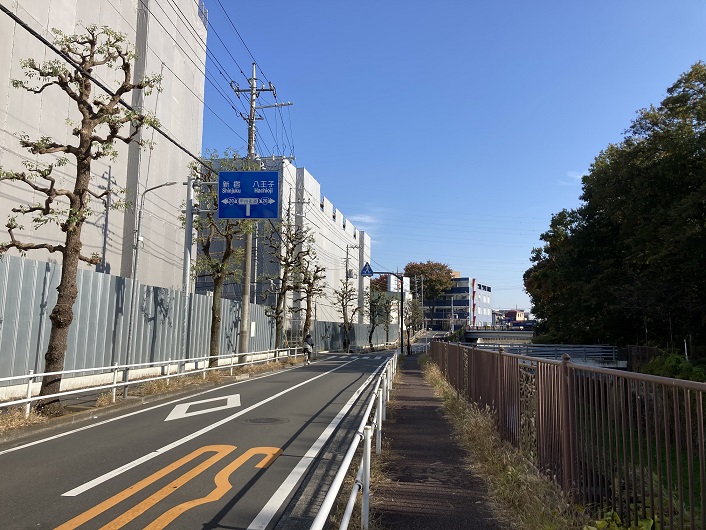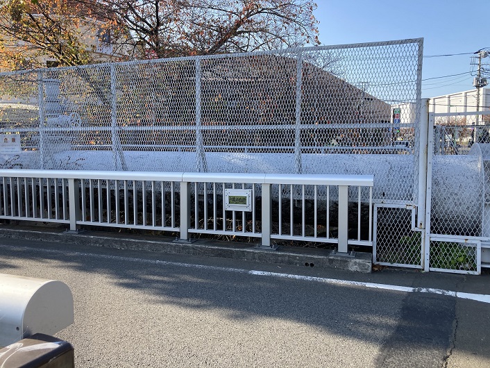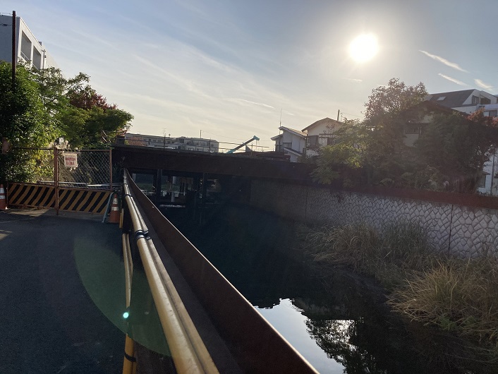 平行して流れる丸子川と水神橋で別れると、仙川が野川に合流する地点に架かるゴールの鎌田橋に到着します。現在は橋の架け替え工事中で合流地点はよく見えません。橋脚の間から見えるのが野川の流れです。