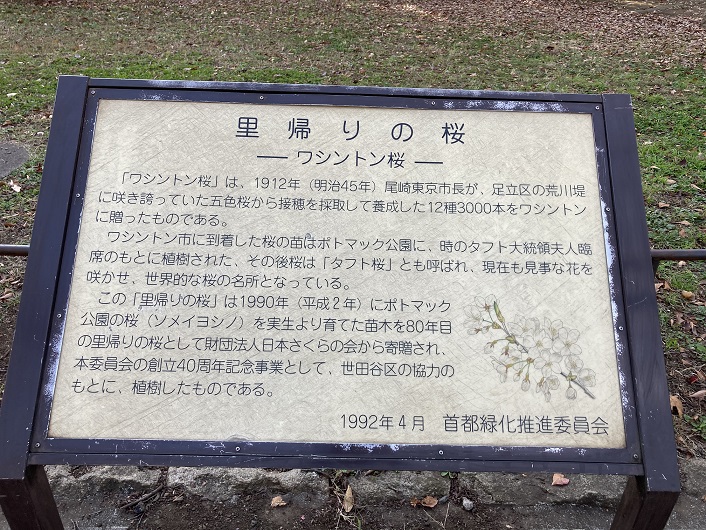 「ワシントン桜」は、明治四十五年(1912年)尾崎東京市長が、足立区の荒川堤に咲き誇っていた五色桜から接穂を採取して養成した12種3000本をワシントンに贈ったものである。ワシントン市に到着した桜の苗はポトマック公園に、時のタフト大統領夫人臨席のもとに植樹された。その後桜は「タフト桜」とも呼ばれ、現在も見事な花を咲かせ、世界的な桜の名所となっている。この「里帰りの桜」は平成二年(1990年)にポトマック公園の桜(ソメイヨシノ)を実生より育てた苗木を80年目の里帰りの桜として財団法人日本さくらの会から寄贈され、本委員会の創立40周年記念事業として、世田谷区の協力のもとに、植樹したものである。