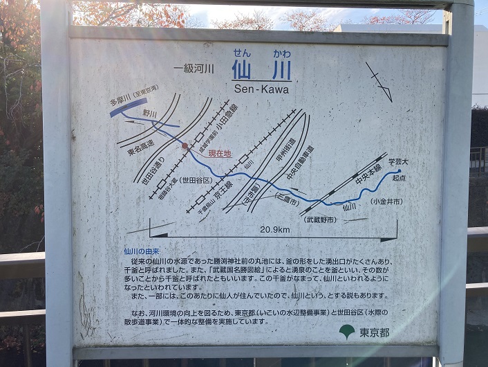 遊歩道の脇に「仙川(せんかわ)の由来」を書いた案内板が立っていました。この案内板では仙川を濁らずに「せんかわ」と表記しているようです。ローマ字表記も添えてありますので、劣化で「が」の「”」が消えたということはなさそうです。