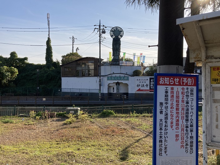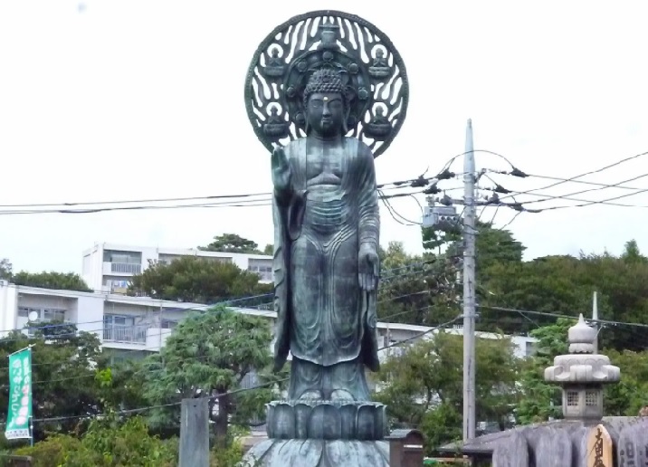 世田谷通りに架かる大倉橋を渡ったすぐ対岸に大きな仏像が背中を見せています。妙法寺というお寺裏の墓地にある「おおくら大佛」だそうです。正確には「久遠大仏」といいます。「回転する」ハイテク大仏として知られ、平成6年(1994年)秋に完成した、高さ8m・重さ8トンのブロンズ製です。午前9時から午後5時までは南に位置する本堂の方を向いていますが、参拝者が近づくとそちらに向きを変えます。午後5時になると北側の世田谷通りを向くようにゆっくりと180度回転します。妙法寺の裏手は切り立った崖になっていますので、世田谷通りからも大仏を見ることができます。私が通りかかったのは昼間だったので背中しか見えませんでしたが、180度回転すると右側の写真のように見えた筈です。