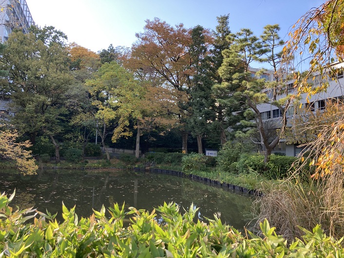 仙川は小田急線の高架下を流れます。その手前には成城学園があります。成城学園には幼稚園・初等学校・中学校高等学校・成城大学・大学院と、保育園以外は全て揃っています。敷地も仙川の両側に拡がっています。仙川の遊歩道から見ると学園の裏側に当りますが、成城池なるものもありますね。ややドブ池っぽい気もしますが。