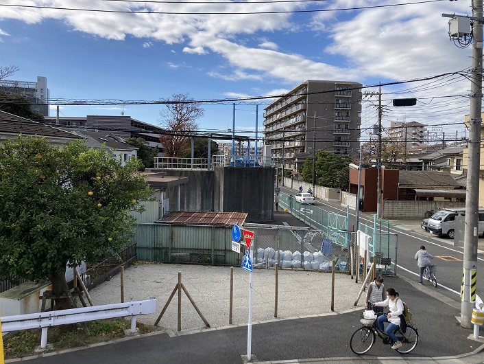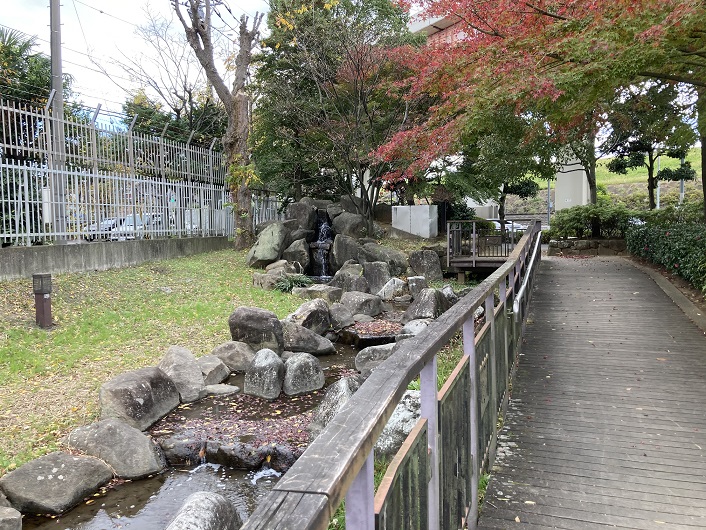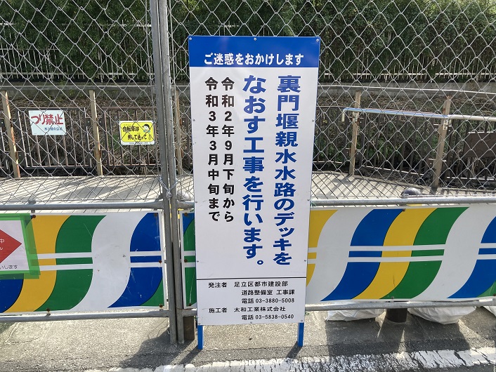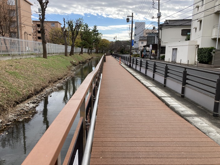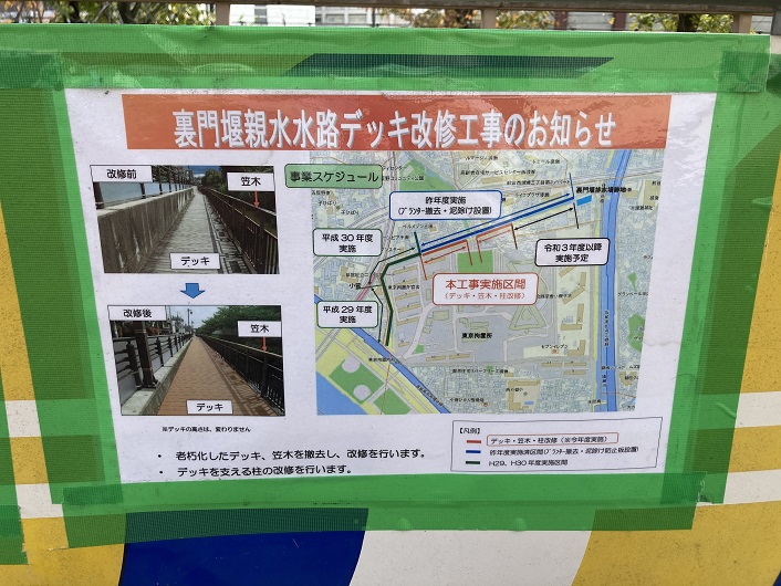 現在は親水水路の途中区間が改修のための工事で閉鎖されています。来春には綺麗な遊歩デッキとなって再開される予定です。尚、改修箇所にある笠木とは、一般的には手摺などの上部に取り付けられる仕上げ材全般を指します。