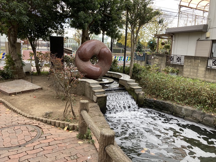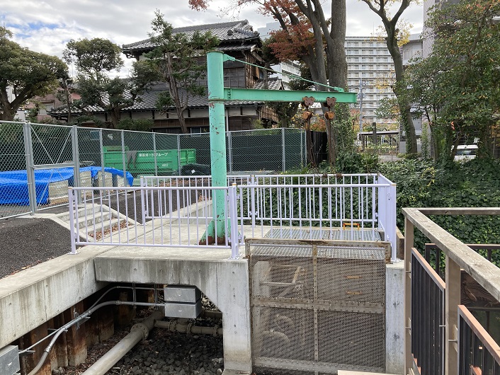 小菅万葉公園の端っこにはポンプらしき施設があります。恐らく、他の場所から水を引いて裏門堰親水水路に流し込んでいるのでしょう。