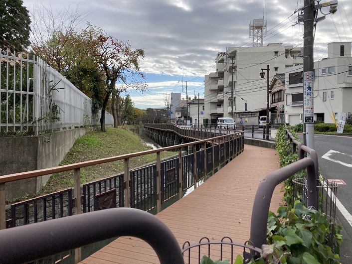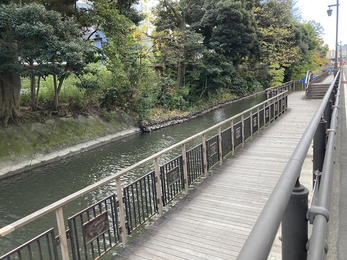 裏門堰親水水路は東京拘置所の角で直角に曲って南下します。最初から水路が曲っていたのか、後で人工的に流路を変えたのかは分かりません。恐らくは両者の折衷なのではないかと思われます。この辺りのデッキは数年前に改修されたばかりで真新しいですね。