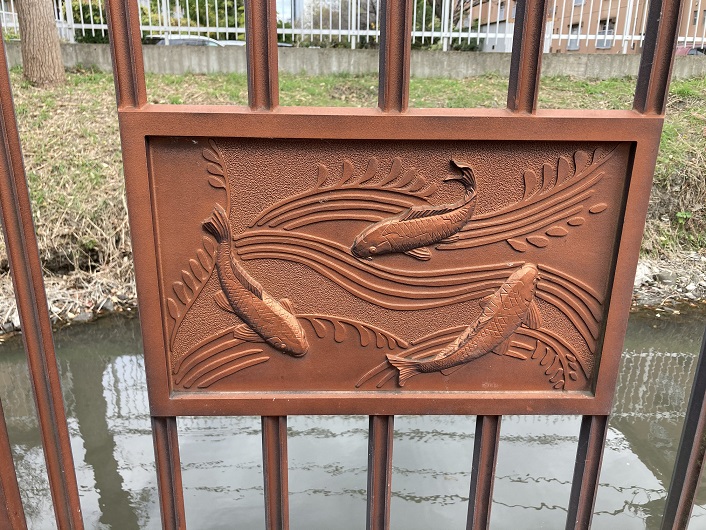 裏門堰排水場の先には遊歩デッキが設置されています。柵には川魚をオブジェにしたプレートが取り付けられています。かっての古隅田川は小魚が泳ぎ回る清流だったのでしょう。