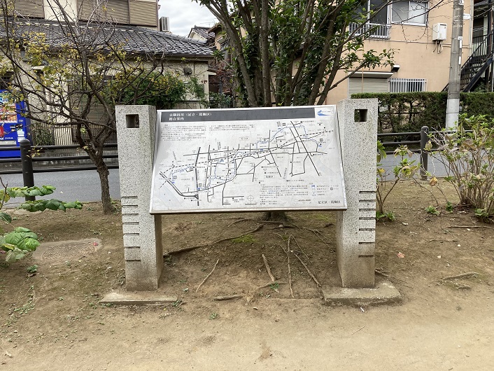 総合案内板は亀有の北三谷橋の袂に設置されていたものと同じ内容です。改めて古隅田川と裏門堰親水水路の流路を見ますと、綾瀬川と接する地点があまりにも離れていて、本当にこの区間は直線的に繋がっていたのかと疑問に思います。実際はどうだったのでしょうか?