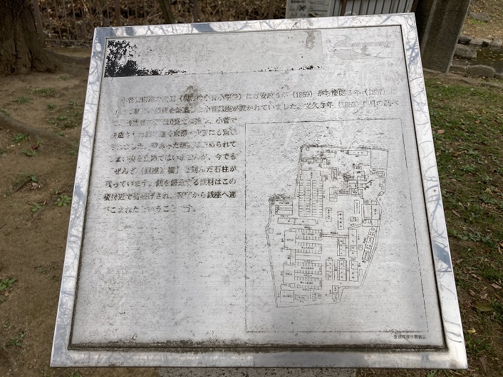 小菅御殿の跡には幕府の小菅銭座なる鋳造所も置かれました。銭を鋳造する材料の鉄材は、小菅御殿に面した古隅田川に架かっていた銭座橋付近から荷揚げされ、小菅御殿の裏門を通って運び込まれました。推測ですが、荷揚げしたところに堰があり、それが「裏門堰親水公園」の名前の由来になったと思われます。銭座橋の親柱は今でも残されているそうですが、現在の裏門堰親水水路とは異なる西小菅小学校近くの道路上にあり、今回は見ることはできませんでした。事前調査が甘かったです。それにしても、小菅御殿の裏門って、どこに位置していたのでしょうね?当時の古隅田川の流路は東京拘置所の正門前辺りも通っていたのでしょうか?