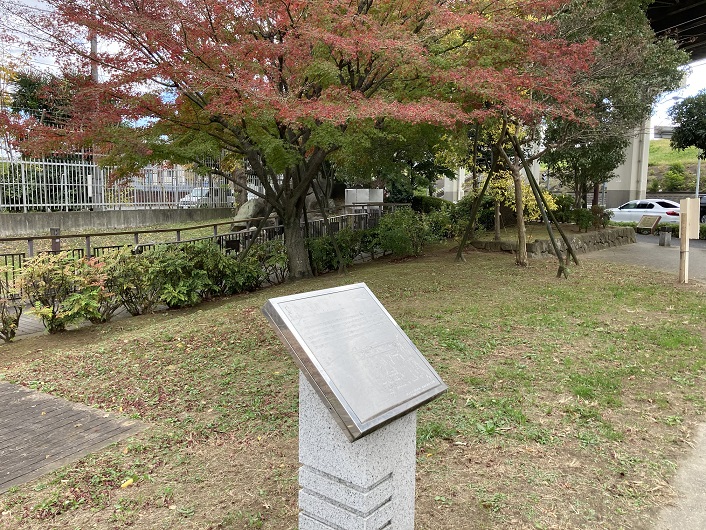 裏門堰親水水路の全長は1.1kmと短く、直ぐに終点の小菅万葉公園に着いてしまいます。ただ、かっての古隅田川は、荒川放水路が開削される前はここから更に隅田川の方向に延びていました。小菅万葉公園内には幾つかの案内板が設置されています。