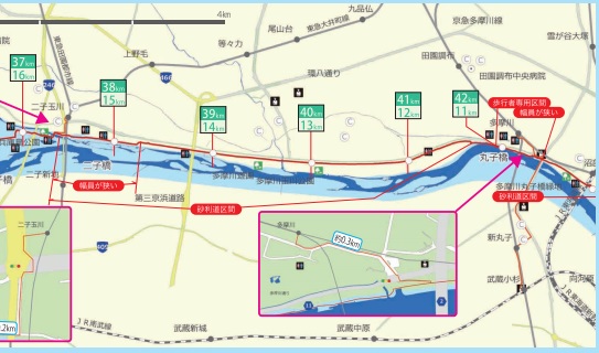 左側のマップは大師橋緑地から丸子橋まで、右側のマップは丸子橋から二子橋までです。