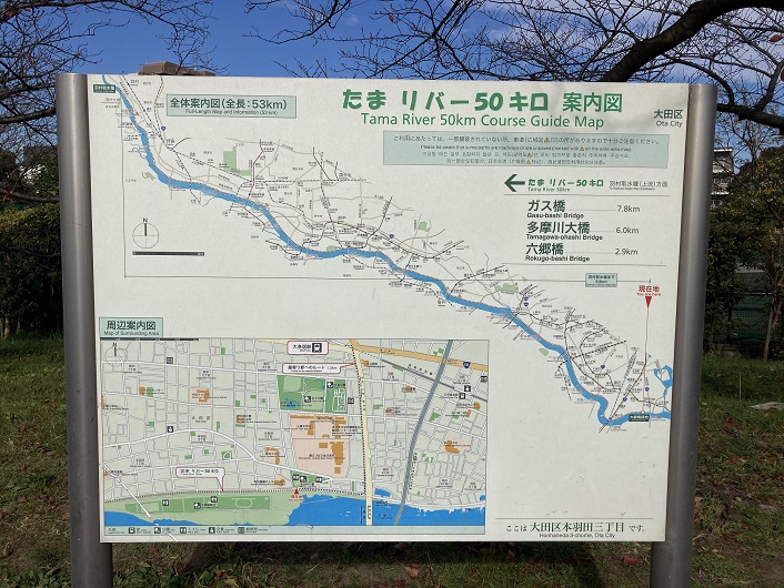 「たま リバー50キロ」は、都民の健康づくりを目的として、多摩川の河川敷等に設けられた約53kmの連続したコースです。平成20年(2008年)5月、東京都都市整備局は多摩川の東京都側(左岸)で「ウォーキング・ランニング・散策などが楽しめるよう、羽田から羽村までのおよそ50キロメートルの区間に案内表示施設の設置や案内マップの作成などを検討する」と発表し、このコースの名称を公募しました。この公募には487件の応募があり、7月に入選作として、「たま リバー50キロ(Tama River 50km Course)」が選定されました。コースは、多摩川に沿って大師橋緑地(大田区本羽田三丁目)から羽村取水堰(羽村市玉川一丁目)までの区間に設定されました。コース名は50キロとなっていますが、実際の距離は53kmです。これは、名称を一般公募したときに50kmと発表したために、これがそのまま引き継がれたものと思われます。尚、「たまリバー50キロ」と表記されることが多いですが、公式には「たま」と「リバー」の間に空白が入ります。