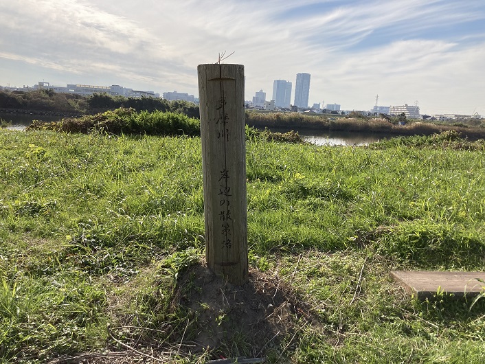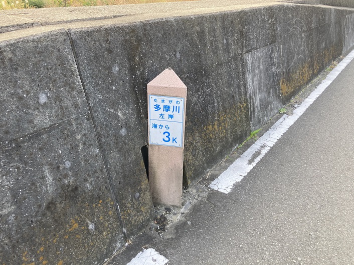 京浜急行の大鳥居駅に降り立ちました。たまリバー50キロコースの始点(終点でもある)となる大師橋緑地に行くには産業道路を経て、多摩川の土手を上流方向に進みます。河川敷は草木が生い茂っていてとても歩けません。開けた河川敷が見えたところに案内板が立っていました。「大鳥居駅まで1.2km」と書いてあります。駅から結構歩きましたもんね。土手の上は本格的な舗装がされている遊歩道になっていて、よく整備されています。歩道の脇に「海から3K」の標識が立っています。ここで言う「海から・・・」の基準点は、多摩川右岸に設置された川崎区殿町の水位観測所となっています。では左岸(東京都側)ではどうやって距離を測るのでしょうか?なんでもソラムナード羽田緑地近くの護岸上に「0.0k」の標識があるみたいです。私は「武蔵野の路」の起点となった弁天橋近くの海老取川が多摩川に合流する地点だとばかり思っていました。「たまリバー50キロ」の実際の距離は53km、河口から3kmの大師橋緑地がスタートポイントということで、この「3km」の違いが歩いている途中で残り距離を算出する際に頭が混乱する原因となりました。